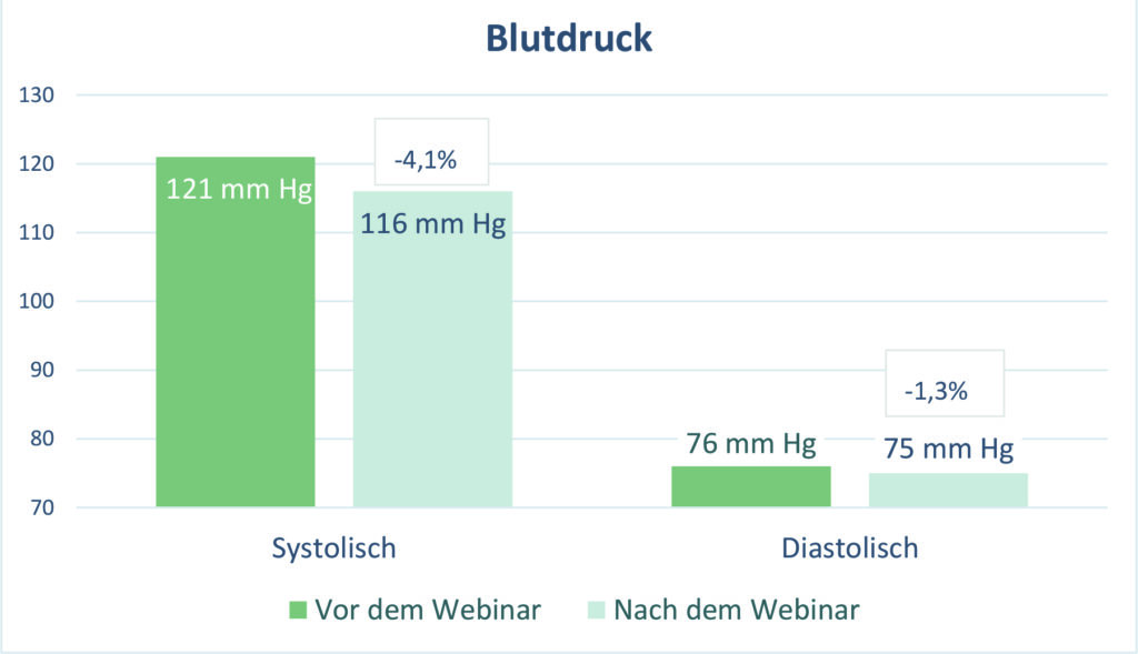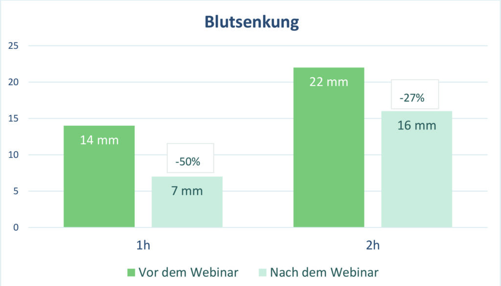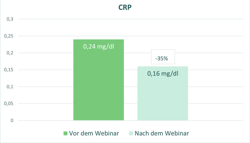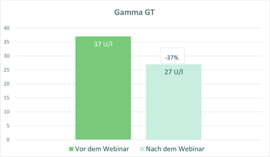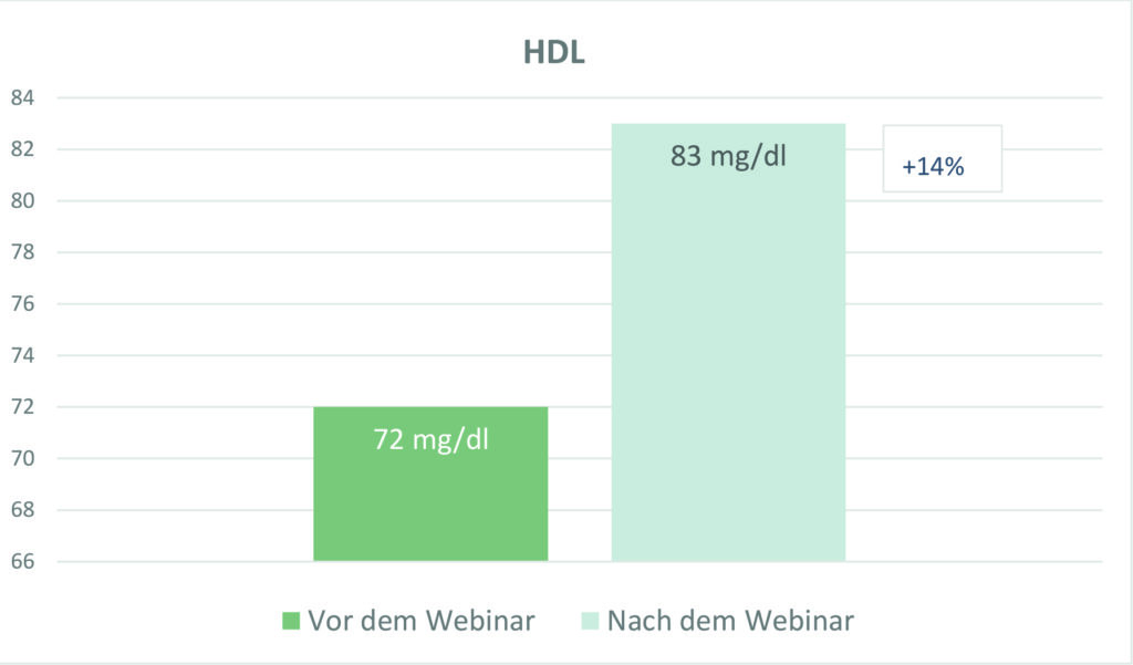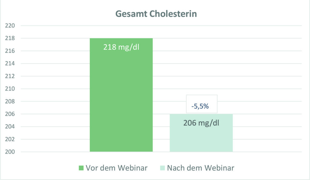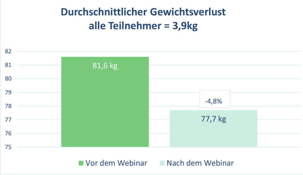 Vor Beginn und am Ende des Webinars wurde bei den Teilnehmern eine Blutabnahme durchgeführt, außerdem wurden Gewicht und Blutdruckwerte eruiert. Alle gemessenen Werte zeigten bei Abschluss der Kur positive Veränderungen in Richtung bessere Gesundheit. Besonders signifikant waren die Gewichtsreduktion, die Leberwerte und die Verbesserung des Lipidprofils, das das Verhältnis der verschiedenen Blutfettwerte zueinander ausdrückt. Der deutliche Anstieg des „guten HDL-Cholesterins“ um 13,9 % ist ein besonders auffälliger Indikator für gute Gesundheit und Reduktion des Herz- Kreislauf-Risikos. Die teilnehmenden Probanden waren besonders glücklich über die durchschnittliche Gewichtsreduktion von annähernd 4 kg in 3,5 Wochen.